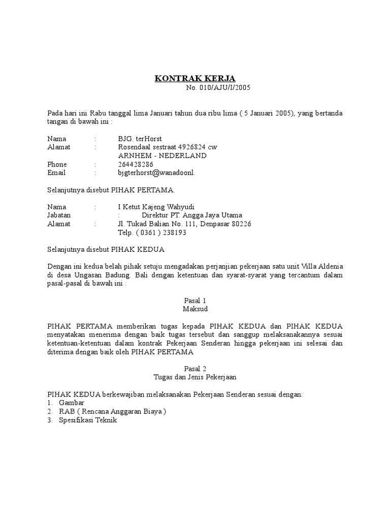 4 Contoh Surat Kontrak Kerja Segala Keperluan from makalah.id Kontrak (perjanjian) adalah suatu peristiwa di mana seorang berjanji kepada orang lain atau di mana dua orang itu saling berjanji untuk melaksanakan suatu hal. Berikut contoh kontrak kerja : Definisi kontrak proyek (konstruksi) kontrak konstruksi adalah juga kontrak bisinis yang merupakan suatu perjanjian dalam bentuk tertulis kelengkapan yang dimaksud dalam kontrak kerja konstruksi, diantaranya kelengkapan desain, kelengkapan gambaran dan kelengkapan jaminan. Surat kontrak kerja proyek ini bisa digunakan, misalnya, untuk pembangunan proyek properti atau sejenisnya. Pengertian sistem kontrak proyek konstruksi. Kontrak kerja konstruksi adalah juga kontrak bisinis yang merupakan suatu perjanjian dalam bentuk tertulis dimana substansi yang disetujui oleh para pihak 2. Keterlambatan pelaksanaan proyek dapat ditolerir apabila terjadi force majeur sesuai pasal 10 ayat 1. Syarat waktu, merupakan syarat yang membatasi berlakunya kontrak tersebut.